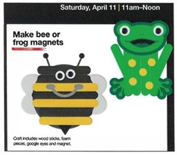 Buzz or hop on into JCPenney for a free craft activity and an extra savings coupon! This month, kids can make and take a bee or frog magnet. Parents get a 10% off coupon. It will BEE a jumping good time!